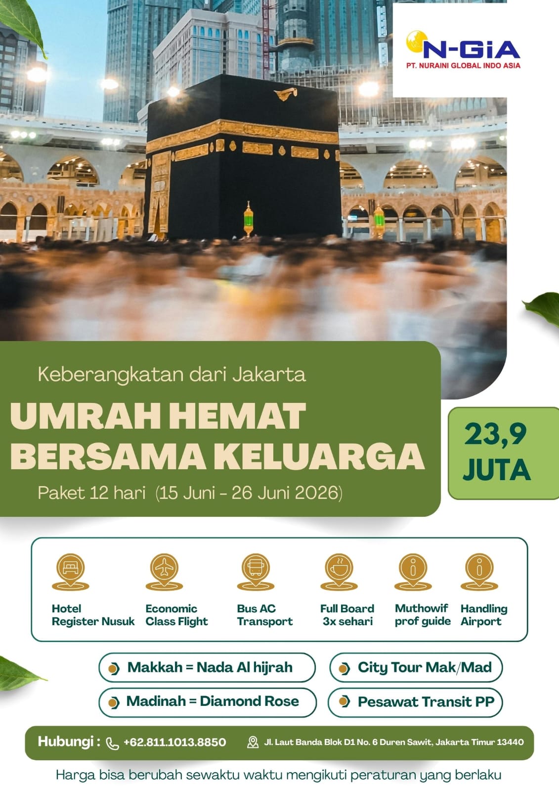 Hubungi kami di +62.811.1013.8850 atau kunjungi kantor di Jl. Laut Banda Blok D1 No. 6 Duren Sawit, Jakarta Timur. Wujudkan impian menjalankan Umrah Hemat Juni 2026 – Bersama Keluarga bersama PT. N-GIA dengan pelayanan profesional dan penuh perhatian.