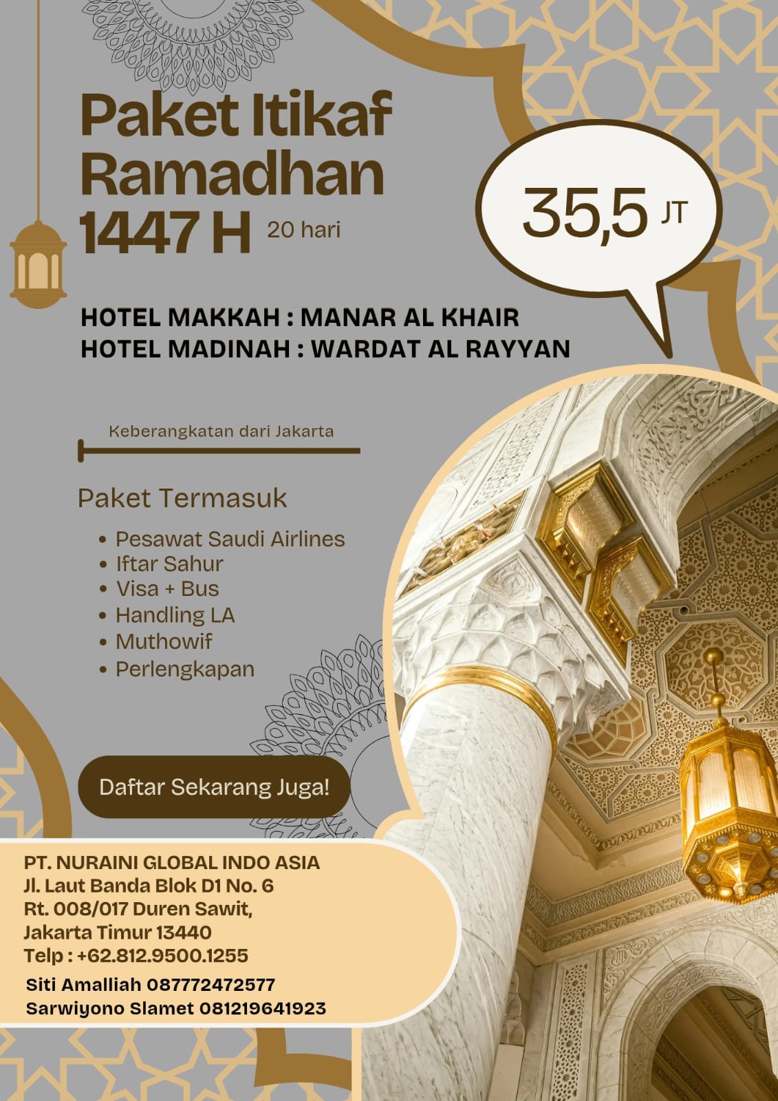 Harga paket Umrah Itikaf Ramadhan 20 Hari N-GIA Tour sangat terjangkau, yaitu mulai dari Rp 35,5 juta. Dengan fasilitas lengkap dan pelayanan profesional, N-GIA Tour berkomitmen memberikan pengalaman spiritual yang tak terlupakan.